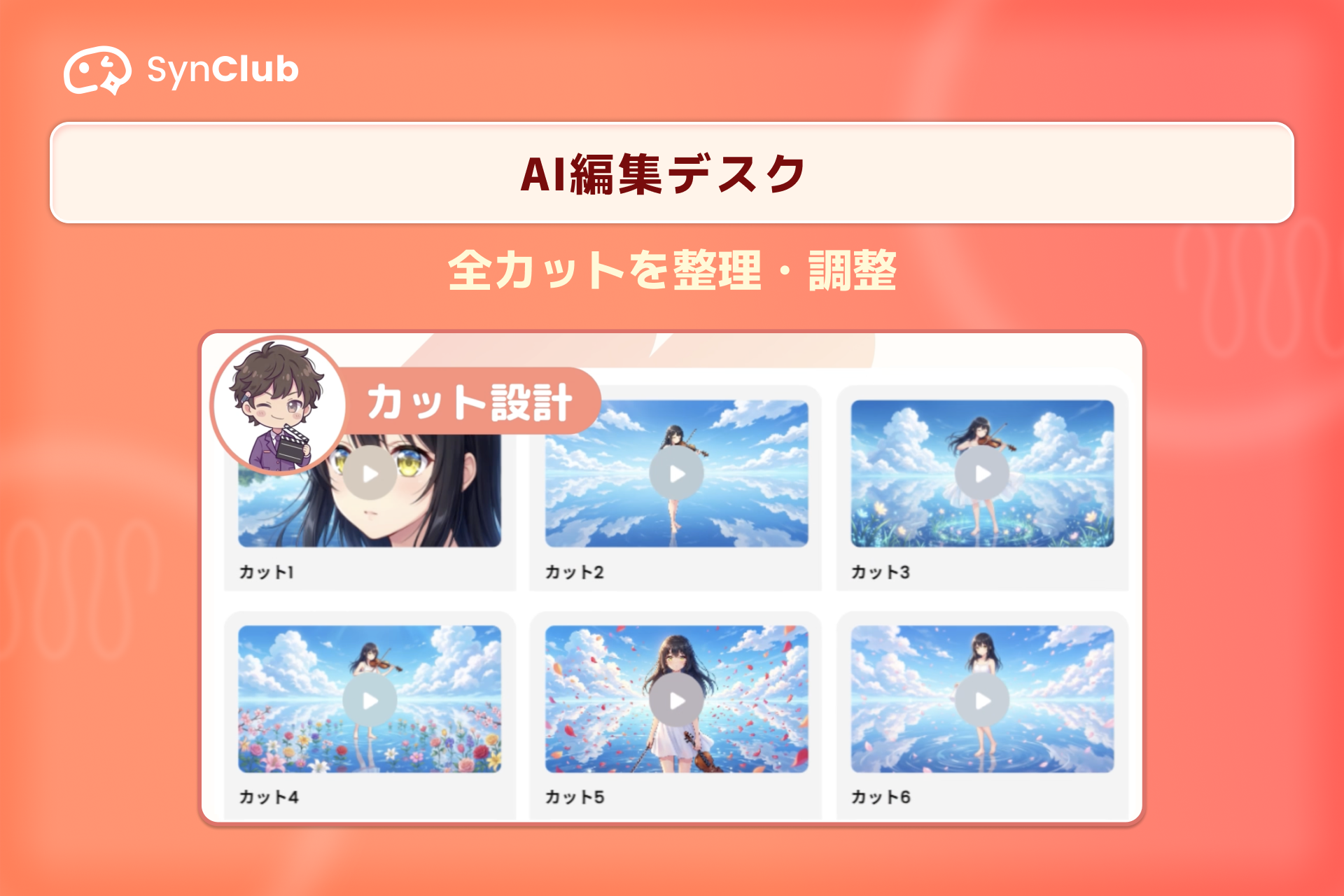 情報を基に動画クリップを一括生成。生成された動画カットは個別再生・編集も可能です。