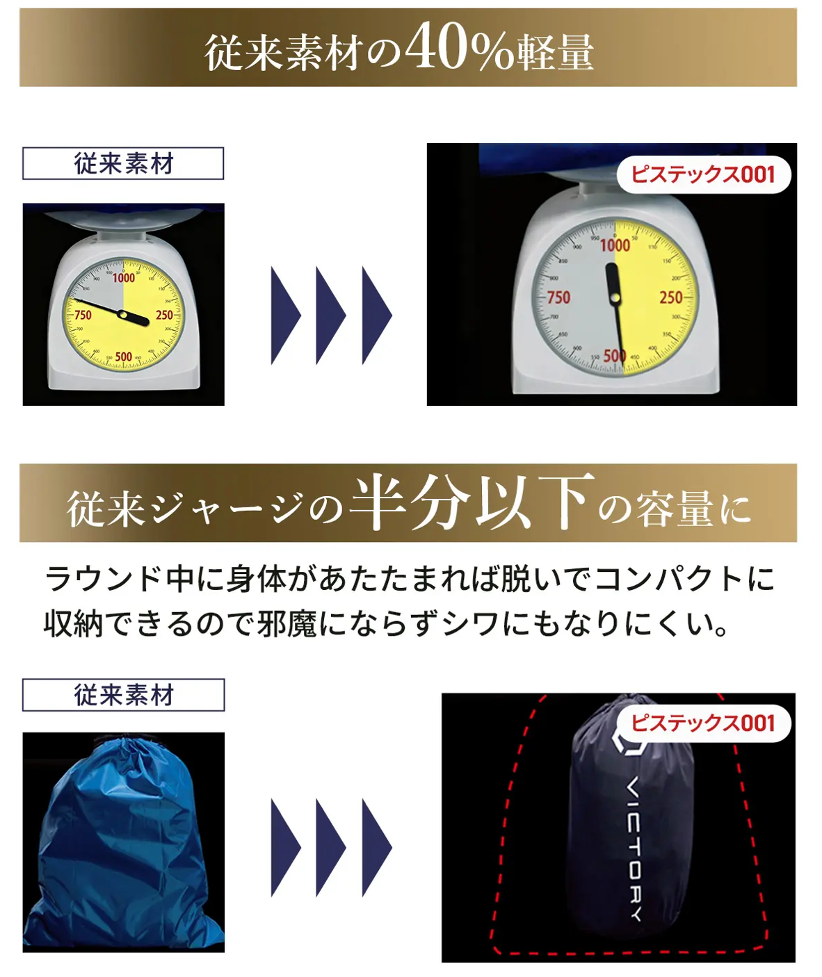 また、従来の体育着の半分以下の容量の為、ラウンド中に身体が温まれば脱いでコンパクトに収納できるので、邪魔にならずシワにもなりにくいです。