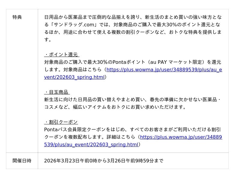 1.サンドラッグ.com (https://plus.wowma.jp/user/34889539/plus/au_event/202603_spring.html)