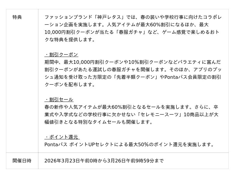 今回は、引っ越しに伴う日用品の買い替えやまとめ買い、卒業式や入学式などの学校行事に必要なアイテムをおトクに揃えていただくため、日用品から医薬品まで圧倒的な品揃えを誇る「サンドラッグ.com」と、ママ世代から絶大な支持を集める「神戸レタス」の2店舗とタッグを組み、最大30%のポイント還元や最大60%割引など、おトクな特典を多数ご用意しています。