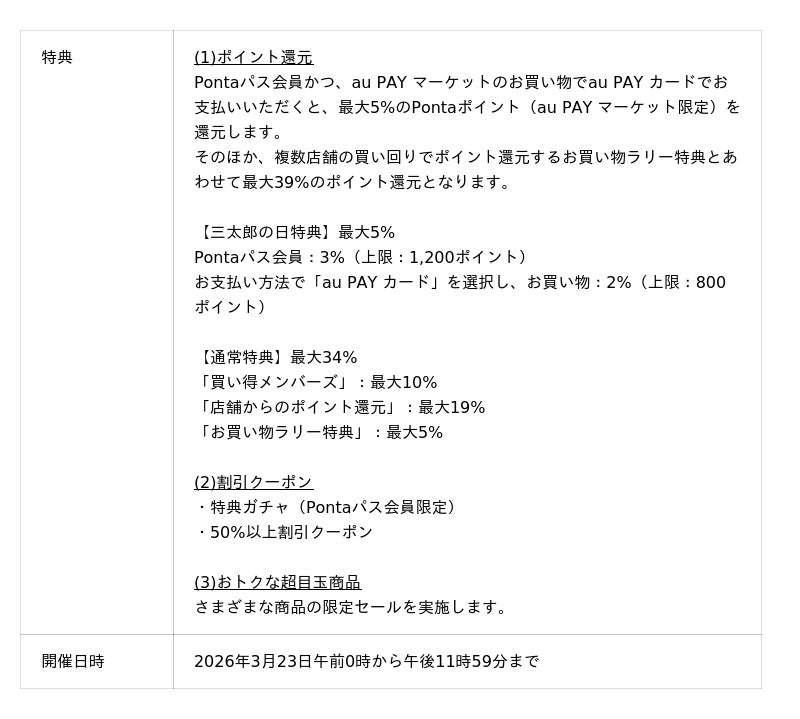 さらに、三太郎の日特典として、Pontaパス会員のお客さまでお買い物時にau PAY カードでお支払いいただくと、最大5%のPontaポイント(au PAY マーケット限定)を還元します。複数店舗の買い回りでポイント還元するお買い物ラリー特典とあわせて、最大39%のポイント還元となります。