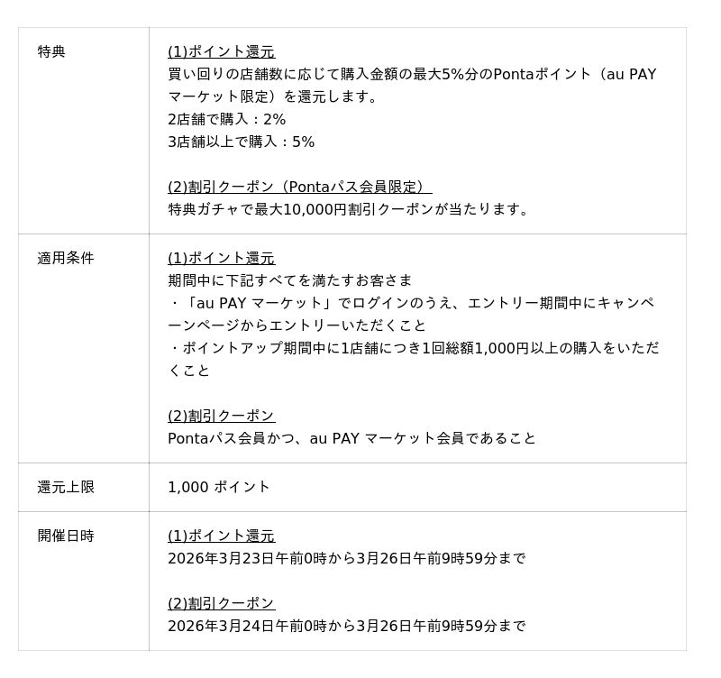 auコマース&ライフは、2026年3月23日から3月26日まで、総合ショッピングサイト「au PAY マーケット」で開催する「三太郎の日」と「お買い物ラリー」において、特別コラボレーションを実施します。