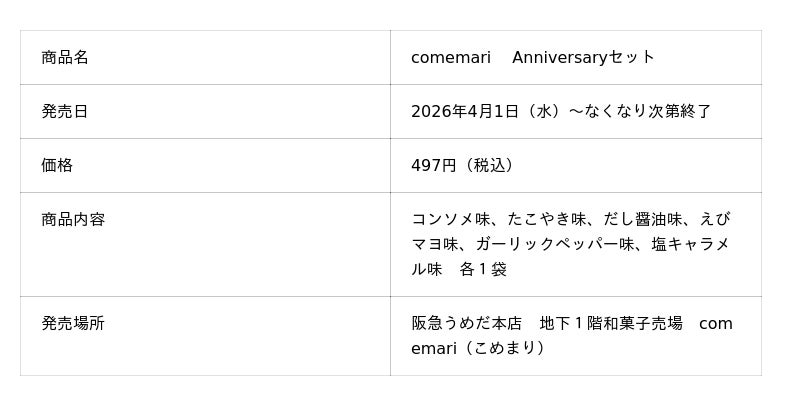お米のスナック専門店「comemari(こめまり)」のリニューアルを記念し、4月1日(水)より阪急うめだ本店の店頭にて、レギュラーフレーバー全6種類をお楽しみいただける「comemari Anniversaryセット」を数量限定で発売いたします。新しくなった「comemari(こめまり)」の味わいをお楽しみください。■ 商品概要