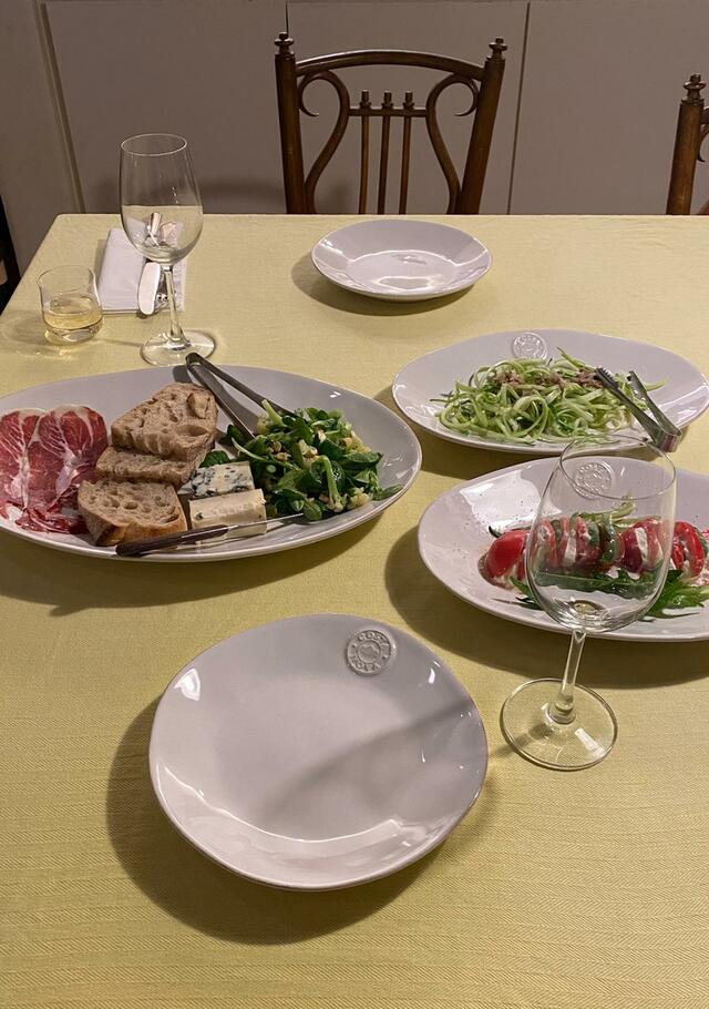 カプレーゼ(トマト、ブッラータ、バジル)、プンタレッレのサラダ。イベリコハム、タバティエール(パン)、ゴルゴンゾーラとタレッジョ(チーズ)、マーシュとカリフローレ(野菜)。ここで満腹。またもやリゾットは延期です。かわいそうなリゾット!