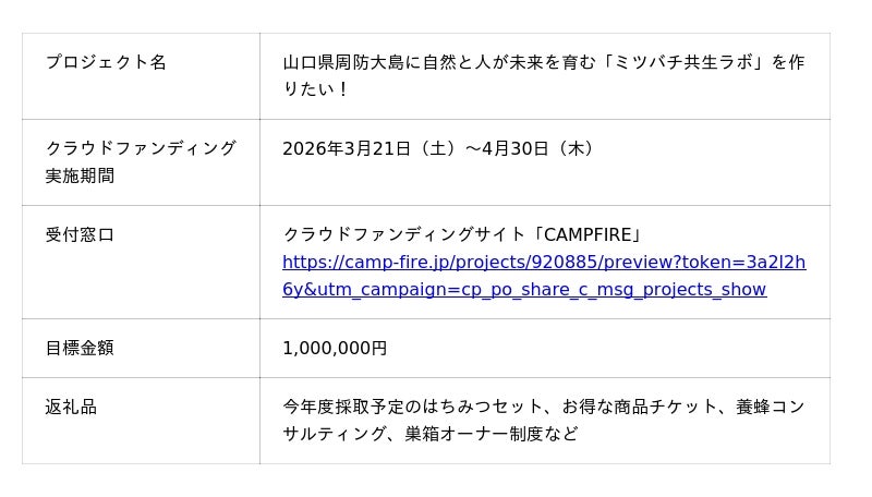 【「ミツバチ共生ラボ」クラウドファンディング概要】