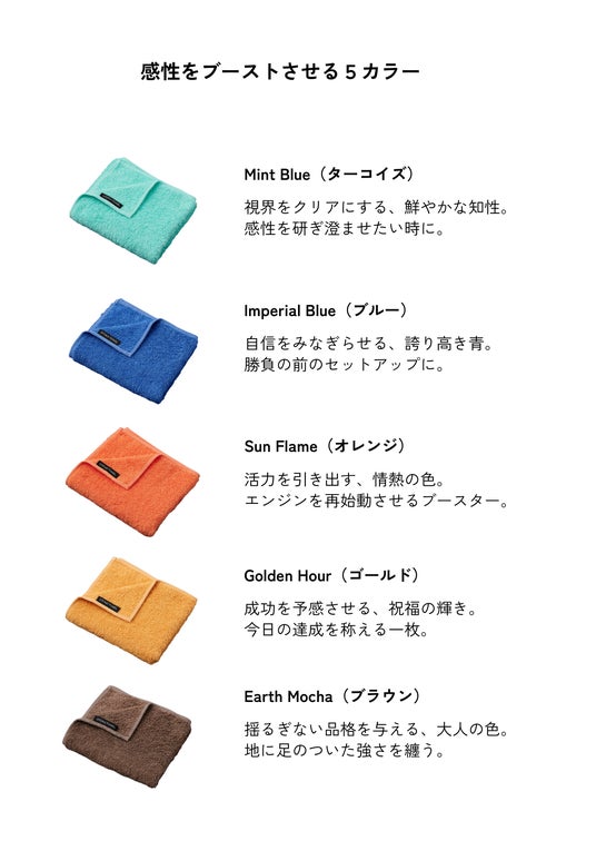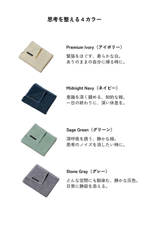 「男タオル(OTOKO TOWEL)」のブランドコンセプトである「Crafted Masculine」をタオルで体現。余計な装飾を削ぎ落とし、飾らない、しかし確かな品質を感じさせる”ギア”としての美しさを追求しました。「女性が選ぶ男性向けギフトタオル」の1stチョイスになって欲しいという思いも込められています。