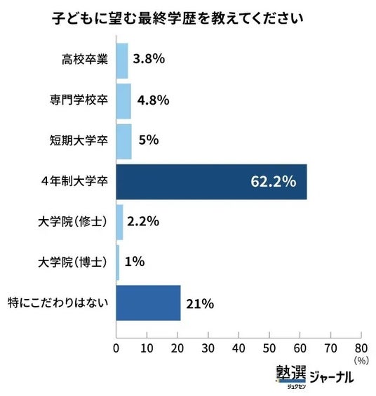 調査で「子どもに望む最終学歴」を尋ねたところ、最も多かったのは「4年制大学卒」(62.2%)でした。次いで「特にこだわりはない」(21.0%)、「専門学校卒」「高校卒業」などが続きます。