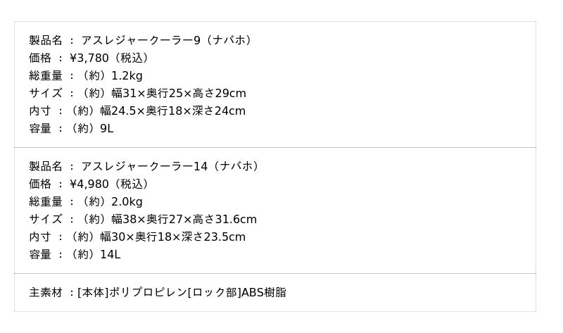 一体成形断熱材採用で、夏場でもしっかり保冷効果を発揮するクーラーボックス「アスレジャークーラー」2サイズを部活動などのスポーツシーンからキャンプまで、さまざまなアウトドアシーンでぜひご活用ください。