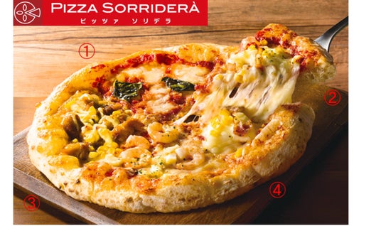 「ピッツァソリデラ・クワトロ・グラツィエ」は、1.チーズトマトのうまみと爽やかなバジルの風味マルゲリータ、2.コクとうまみのポテトとベーコン、3.甘辛タレが絡むてりやきチキン、そして4.魚介の旨みが広がるシーフードの4つの人気のピッツアを一度に楽しめる贅沢な一枚です。選ぶ楽しさとシェアする喜びをひとつにした、心もお腹も満たす充実感たっぷりなピッツアです。