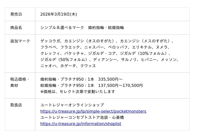 株式会社ユートレジャー(本社:東京都新宿区、代表取締役社長:青木 興一、株式会社ケイ・ウノの連結子会社)は、婚約・結婚指輪にポケモンのマークやカラーストーンを追加するサービスを展開しています。