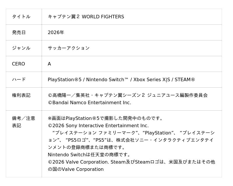 株式会社バンダイナムコエンターテインメントは、PlayStation(R)5 / Nintendo Switch(TM) / Xbox Series X|S / STEAM(R) にて2026年に発売予定のサッカーアクションゲーム「キャプテン翼2 WORLD FIGHTERS」につきまして、前作から進化したシステムを中心に、簡単操作で楽しめる本作の魅力を紹介するシステムトレーラーを公開いたしました。