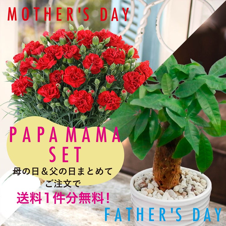 母の日には定番の赤いカーネーションの鉢植えを、父の日には育てやすい観葉植物・パキラの白陶器鉢植えを贈るお得なセットです。
