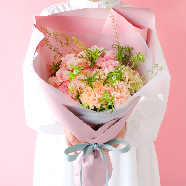 淡いピンクと優しいベージュが柔らかく溶け合い、ふんわり寄り添うやさしい色合いの花々が、お母さまへ伝えきれない気持ちをそっと届けます。