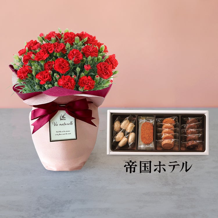 母の日の象徴ともいえる赤いカーネーションの鉢植えと<帝国ホテル>で人気のクッキー詰合せのセットです。育てやすい鉢植えは、可愛らしいラッピングでより一層喜ばれる人気のアイテム。