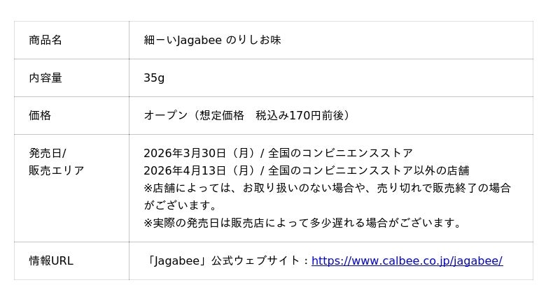 カルビー株式会社(本社:東京都千代田区、代表取締役社長兼CEO:江原 信)は、じゃがいもの味わいと独自の食感が楽しめる「Jagabee」より、細いウェーブカットが特長の『細-いJagabee のりしお味』を、2026年3月30日(月)から全国のコンビニエンスストア先行で期間限定発売します。コンビニエンスストア以外の店舗では、2026年4月13日(月)から期間限定発売します(同年7月下旬終売予定)。
