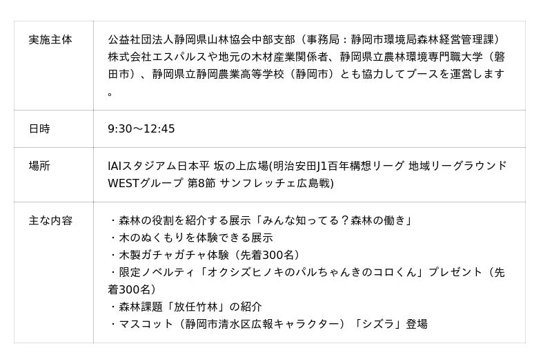 本企画は、静岡市の森林や木材の価値を多くの市民等に伝えることを目的に、静岡市をホームタウンとする清水エスパルスのJ1リーグホームゲームにおいて、公益社団法人静岡県山林協会中部支部(事務局:静岡市環境局森林経営管理課)によって実施されるものです。会場では、静岡市の面積の約76%を占める森林の働きや、地域木材の魅力を紹介する展示を行います。また、来場者のアクションに応じてオクシズ材を活用したノベルティグッズを配布するなど、体験型コンテンツを通して森林や木材を身近に感じてもらう機会を創出します。