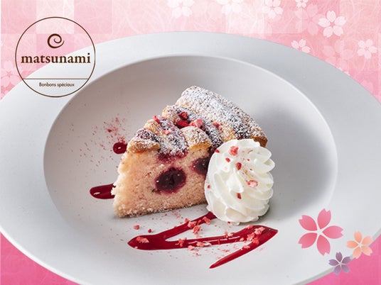 桜が香るケーキ生地に、甘酸っぱいベリージャムとチェリーのコンポートを混ぜ込みました。