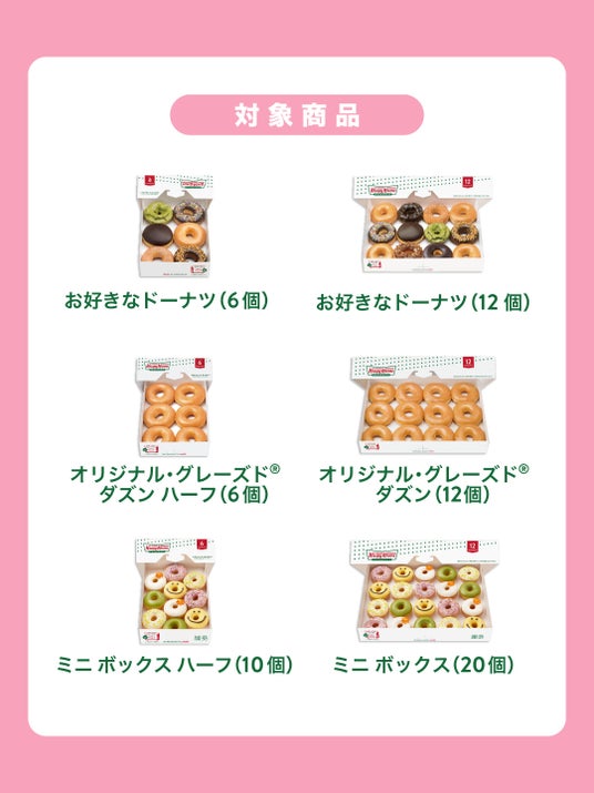 『お好きなドーナツ6個』は通常100円OFFのところ150円OFF、『お好きなドーナツ12個』は通常最大1,728円分お得となるところ、最大1,778円分お得にご購入いただけます。対象商品は『オリジナル・グレーズド(R) ダズン (12 個)』『ミニ ボックス(20個)』なども含まれる他、本キャンペーンは期間中何度でもご利用いただくことができます。