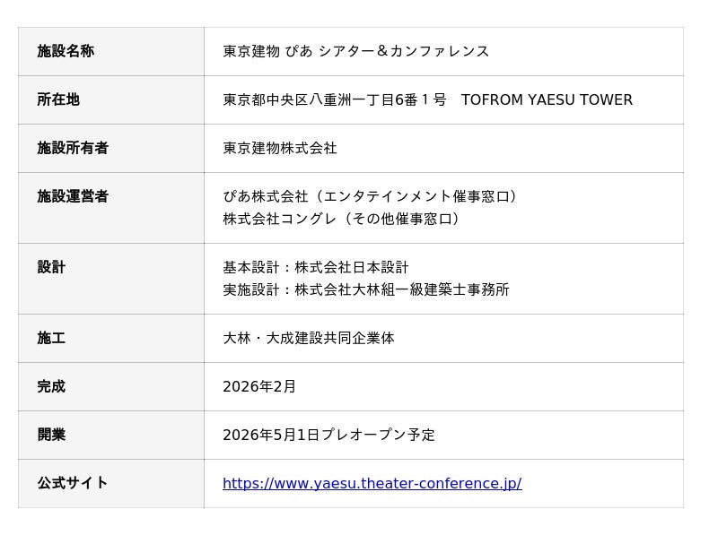 ぴあ株式会社、株式会社コングレ、東京建物株式会社は、東京駅前の大規模複合施設TOFROM YAESU TOWER(トフロム ヤエス タワー)※1内の劇場・カンファレンス施設(以下「本施設」)の名称を「東京建物 ぴあ シアター&カンファレンス」とし、2026年5月1日にプレオープンすることをお知らせします。本施設は東京建物が所有し、ぴあ・コングレが共同で運営します。