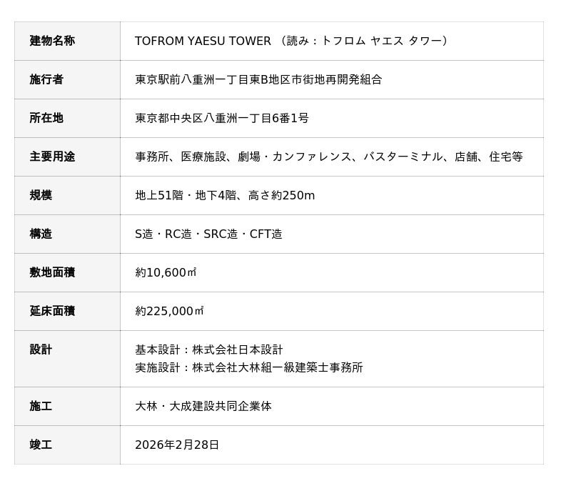 TOFROM YAESU TOWERは、2026年2月28日に竣工した、東京駅八重洲口前に所在する地下4階、地上51階の大規模複合ビルです。八重洲地下街(ヤエチカ)を介し東京駅に直結し、オフィス、商業施設、劇場・カンファレンス、バスターミナル、医療施設など多様な用途で構成され、国際都市東京の玄関口にふさわしい都市機能の強化と国際競争力の向上に貢献します。名称の「TOFROM」は、英語の「TO」と「FROM」を組み合わせた造語で、日本中、ひいては世界中のヒト・モノ・コトがここに集まってつながり、ここから多様な価値が生み出され、発信されていく場所になってほしいという思いが込められています。