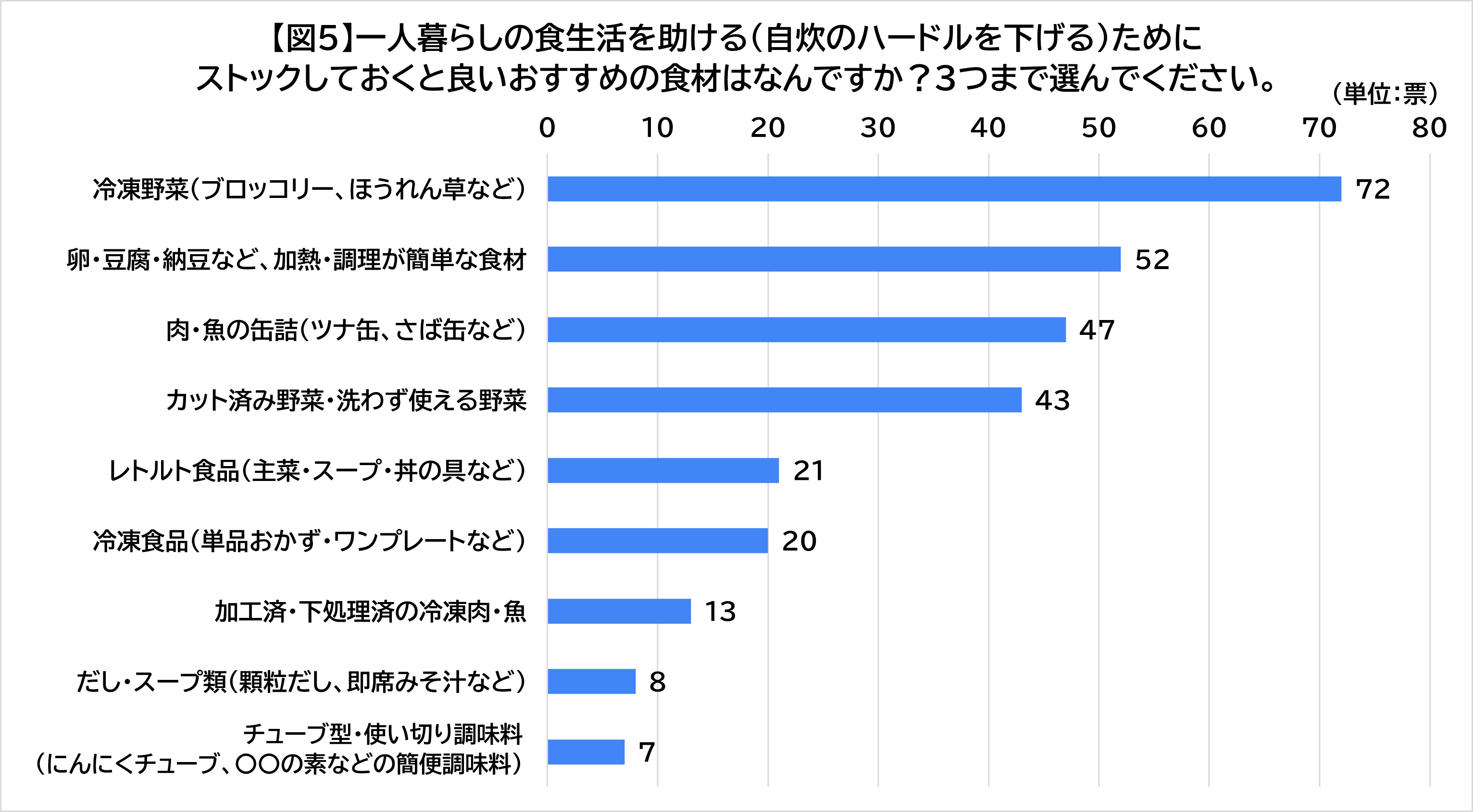 【図5】一人暮らしの食生活を助ける(自炊のハードルを下げる)ために、ストックしておくと良いおすすめの食材はなんですか?
