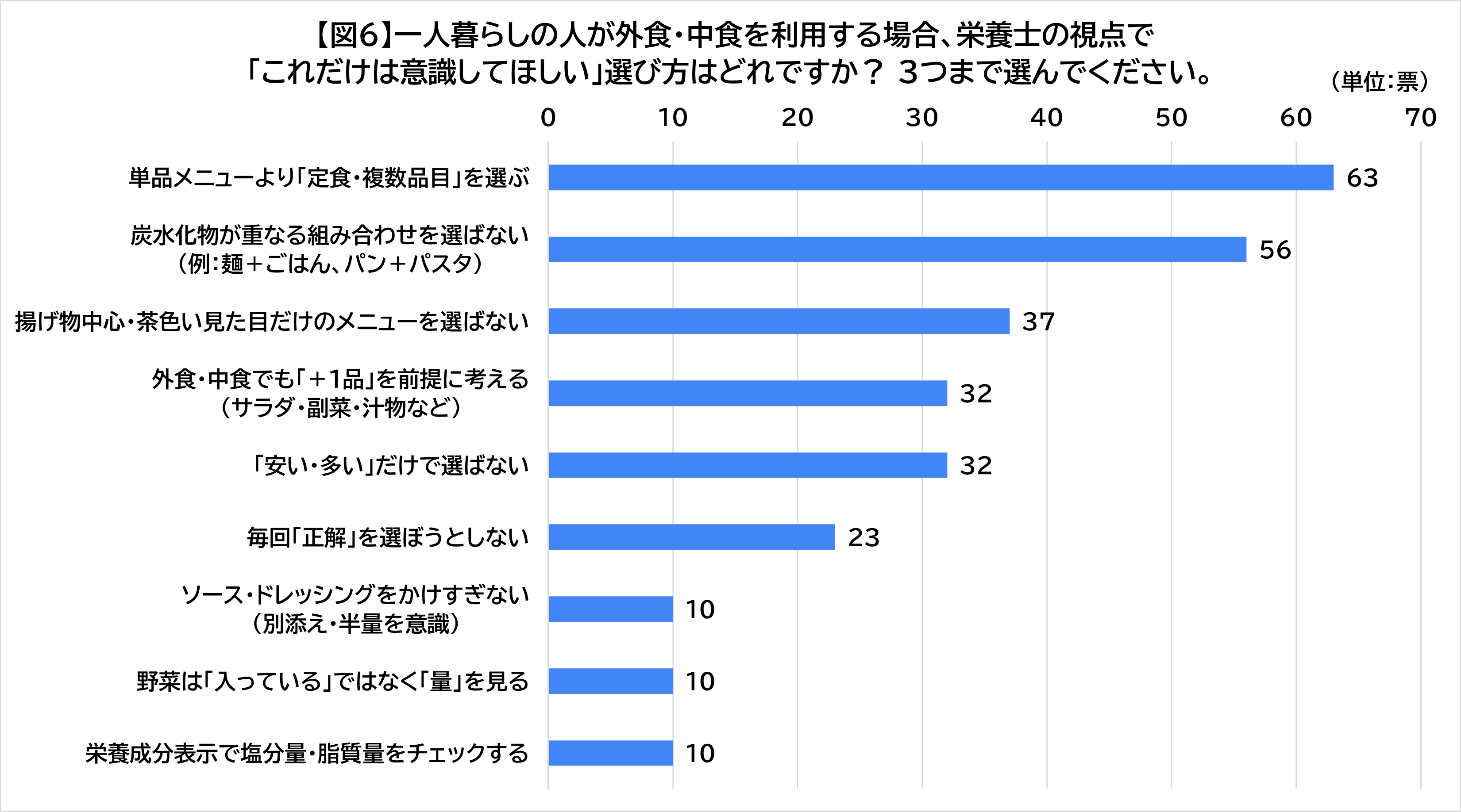 一人暮らしの人が外食・中食を利用する場合、栄養士の視点で「これだけは意識してほしい」選び方を3つまで選んでもらったところ、以下の回答が得られました。【図6】