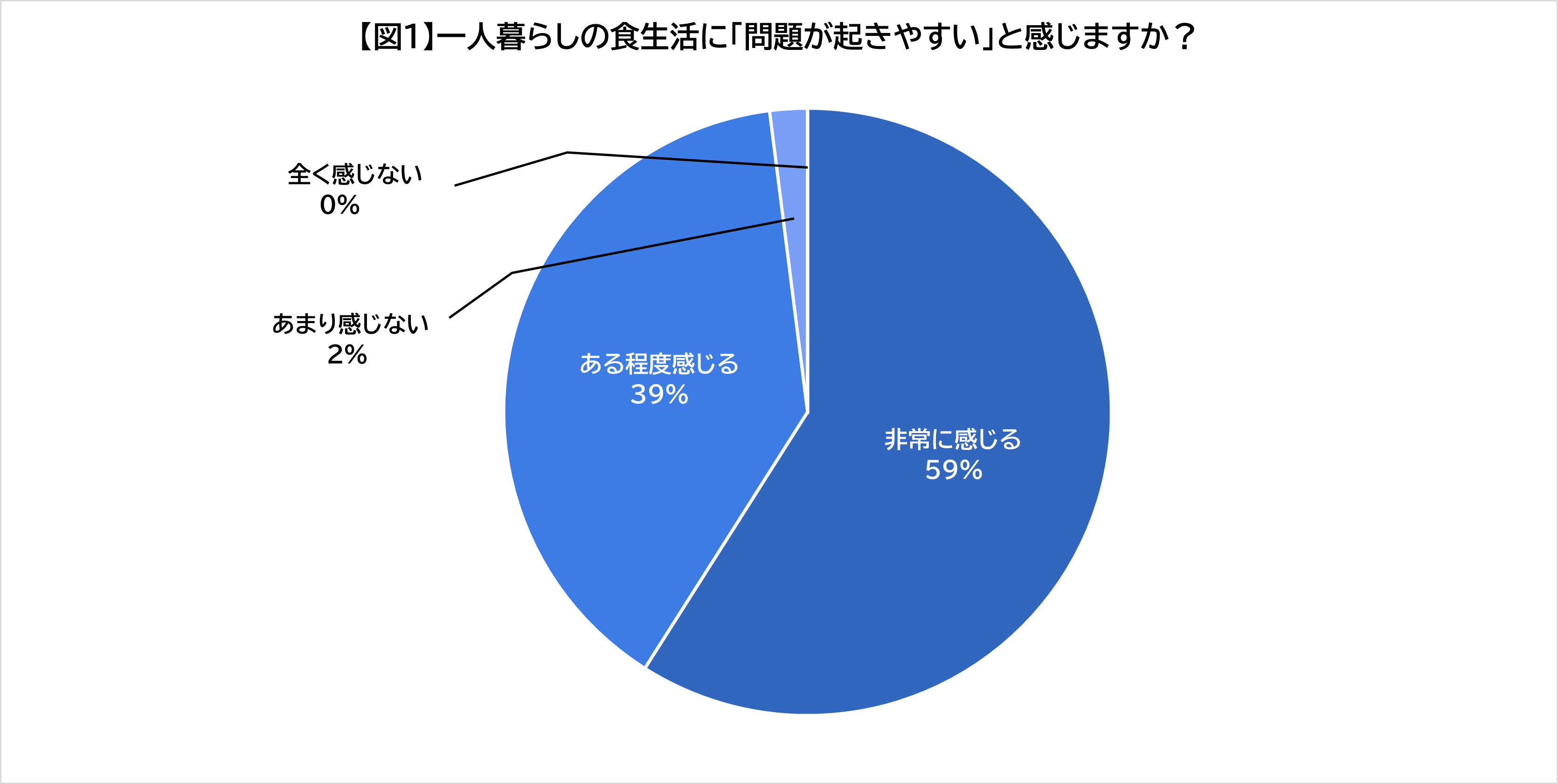 一人暮らしの食生活に対して、問題が起きやすいと感じるかどうかを聞いたところ、98%が「問題が起きやすいと感じる」(非常に感じる59%、ある程度感じる39%)と回答しました。【図1】