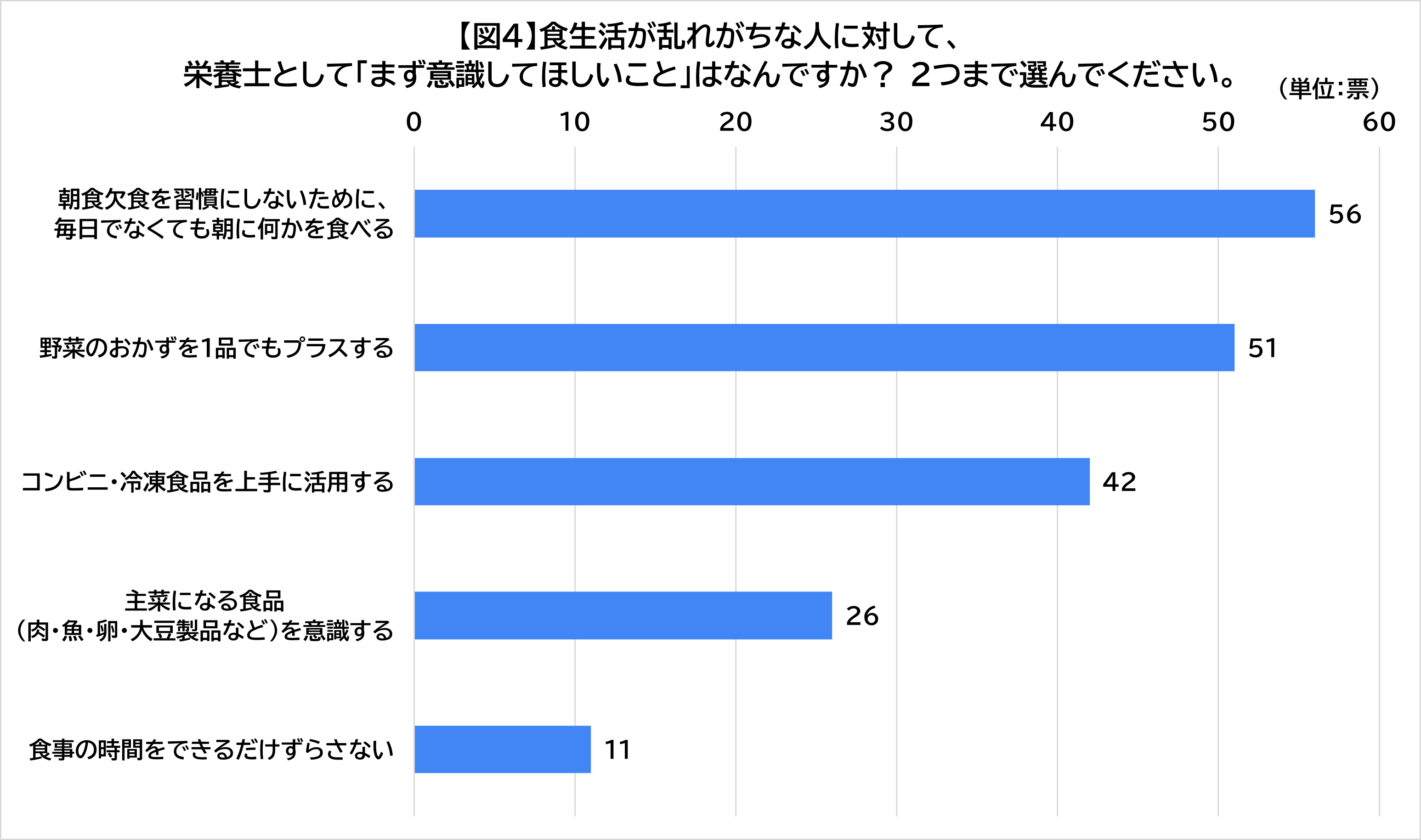 食生活が乱れがちな人に対して、栄養士として「まず意識してほしいこと」を2つまで聞いたところ、以下の回答が得られました。【図4】