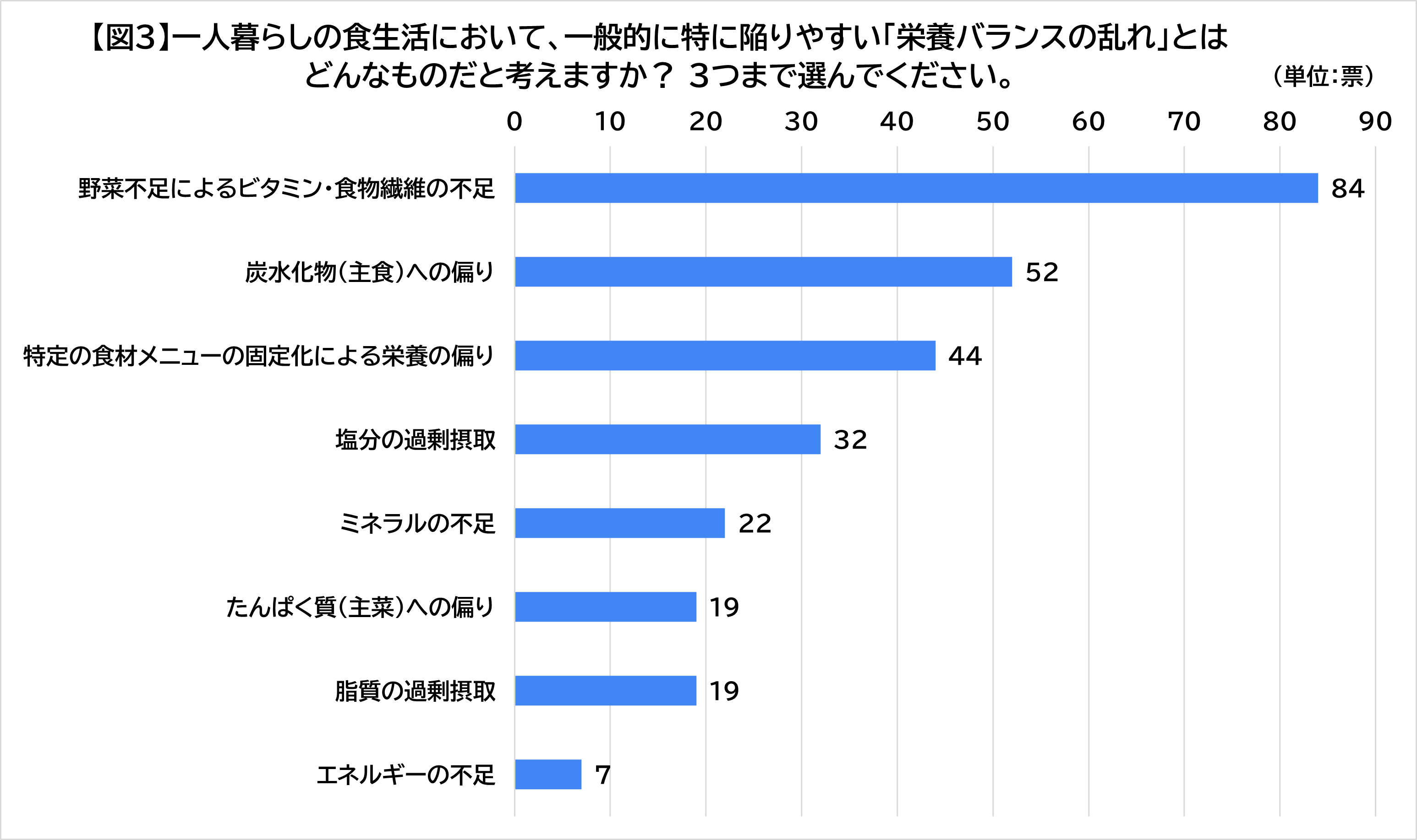 一人暮らしの食生活において、一般的に特に陥りやすい「栄養バランスの乱れ」を3つまで聞いたところ、以下の回答が得られました。【図3】