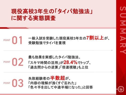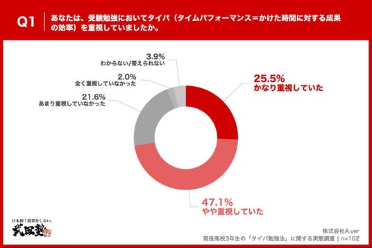 学習塾「武田塾」を全国に展開している株式会社A.ver(本社:東京都文京区以下「武田塾」)は、一般入試を受験した現役高校3年生102名を対象に、現役高校3年生の「タイパ勉強法」に関する実態調査を実施しましたので、お知らせいたします。