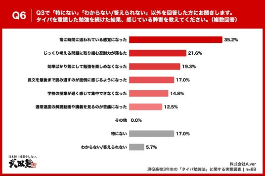 「Q6. Q3で「特にない」「わからない/答えられない」以外を回答した方にお聞きします。タイパを意識した勉強を続けた結果、感じている弊害を教えてください。(複数回答)」(n=88)と質問したところ、「常に時間に追われている感覚になった」が35.2%、「じっくり考える問題に取り組む忍耐力が落ちた」が21.6%、「効率ばかり気にして勉強を楽しめなくなった」が19.3%という回答となりました。