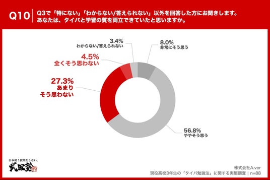 「Q10. Q3で「特にない」「わからない/答えられない」以外を回答した方にお聞きします。あなたは、タイパと学習の質を両立できていたと思いますか。」(n=88)と質問したところ、「あまりそう思わない」が27.3%、「全くそう思わない」が4.5%という回答となりました。