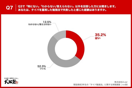 「Q7. Q3で「特にない」「わからない/答えられない」以外を回答した方にお聞きします。あなたは、タイパを重視した勉強法で失敗したと感じた経験はありますか。」(n=88)と質問したところ、「はい」が35.2%、「いいえ」が52.3%という回答となりました。