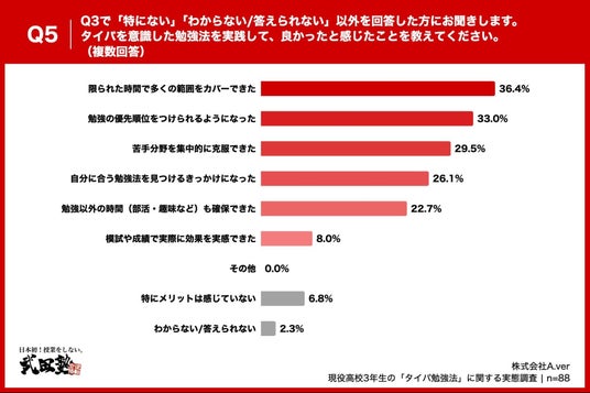 「Q5. Q3で「特にない」「わからない/答えられない」以外を回答した方にお聞きします。タイパを意識した勉強法を実践して、良かったと感じたことを教えてください。(複数回答)」(n=88)と質問したところ、「限られた時間で多くの範囲をカバーできた」が36.4%、「勉強の優先順位をつけられるようになった」が33.0%、「苦手分野を集中的に克服できた」が29.5%という回答となりました。