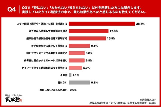 「Q4. Q3で「特にない」「わからない/答えられない」以外を回答した方にお聞きします。実践していたタイパ勉強法の中で、最も効果があったと感じるものを教えてください。」(n=88)と質問したところ、「スキマ時間(通学中・休憩中など)を活用する」が28.4%、「過去問から逆算して勉強範囲を絞る」が17.0%という回答となりました。