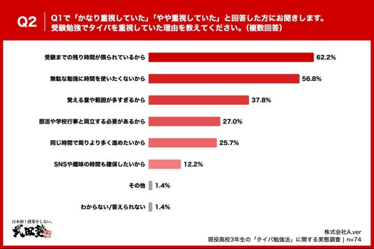 「Q2. Q1で「かなり重視していた」「やや重視していた」と回答した方にお聞きします。受験勉強でタイパを重視していた理由を教えてください。(複数回答)」(n=74)と質問したところ、「受験までの残り時間が限られているから」が62.2%、「無駄な勉強に時間を使いたくないから」が56.8%、「覚える量や範囲が多すぎるから」が37.8%という回答となりました。