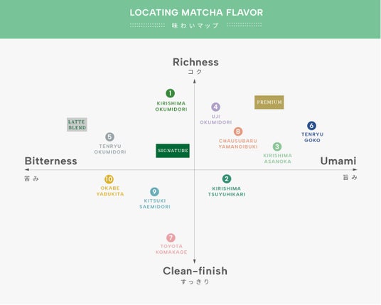 10種類のオーガニック シングルオリジン抹茶リーフの違いをひと目で把握できるよう、味わいマップを制作しました。