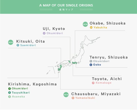 これまで7種類で展開していたシングルオリジンに、「茶臼原 山の息吹(宮崎県)」「杵築 さえみどり(大分県)」「岡部 やぶきた(静岡県)」の3種を追加し、全10種類になりました。産地や品種の違いを、これまで以上に明確にお楽しみいただけます。