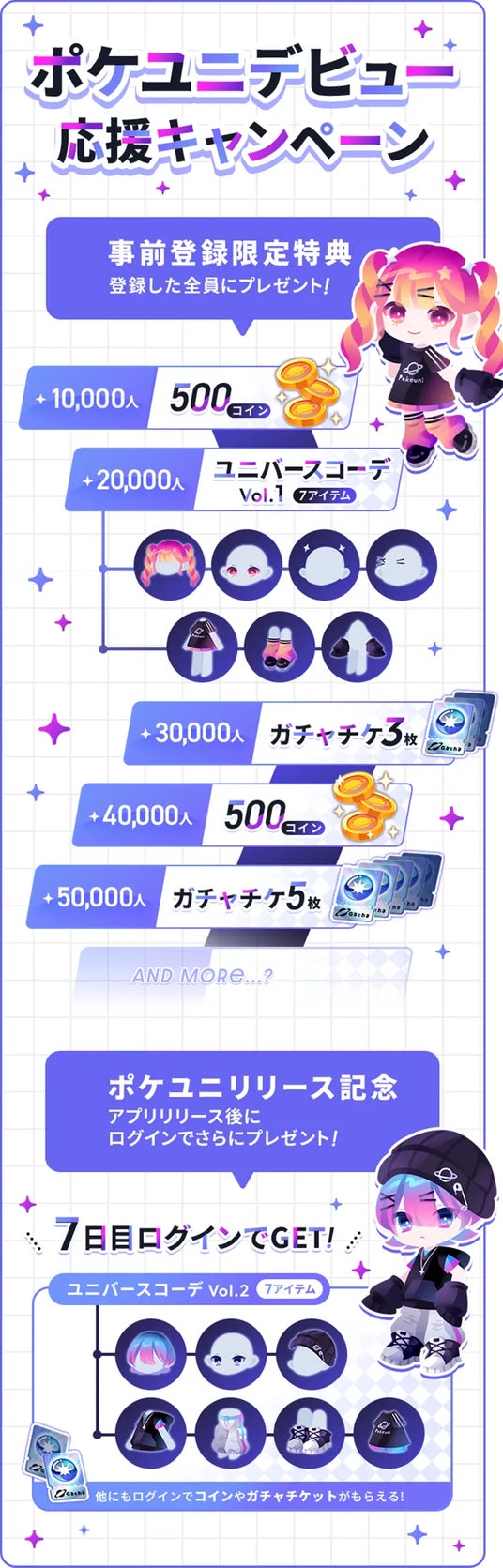 7日間ログインで「ユニバースコーデ Vol.2」(7アイテム)をプレゼントします。
