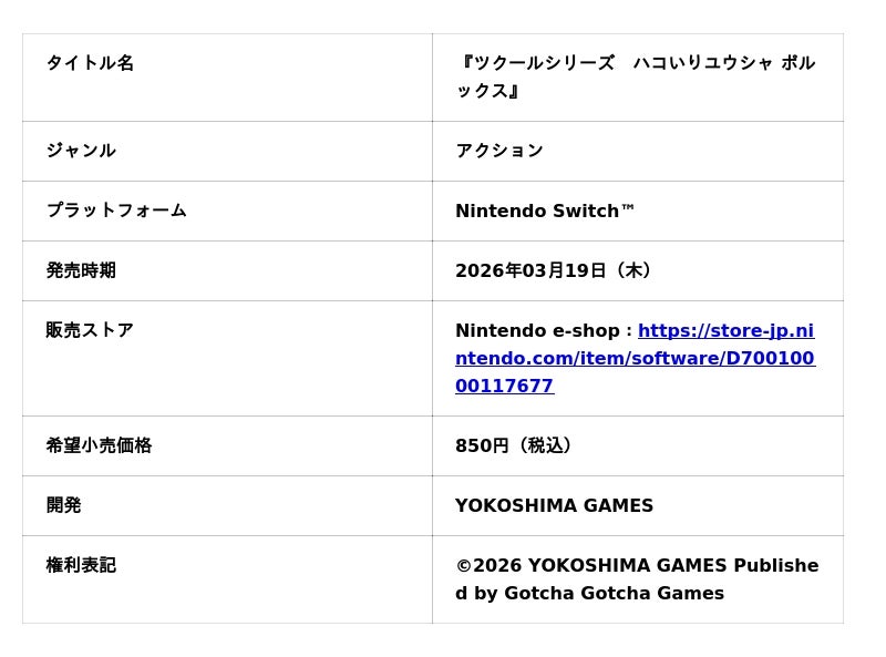 このたび、株式会社KADOKAWAのグループ会社である株式会社Gotcha Gotcha Games(本社:東京都千代田区、代表取締役社長:成田聖)より、2026年3月19日(木)に、『ツクールシリーズハコいりユウシャ ポルックス』をニンテンドーeショップにて発売させていただきましたこと、及び発売記念セールを開催することをお知らせいたします。