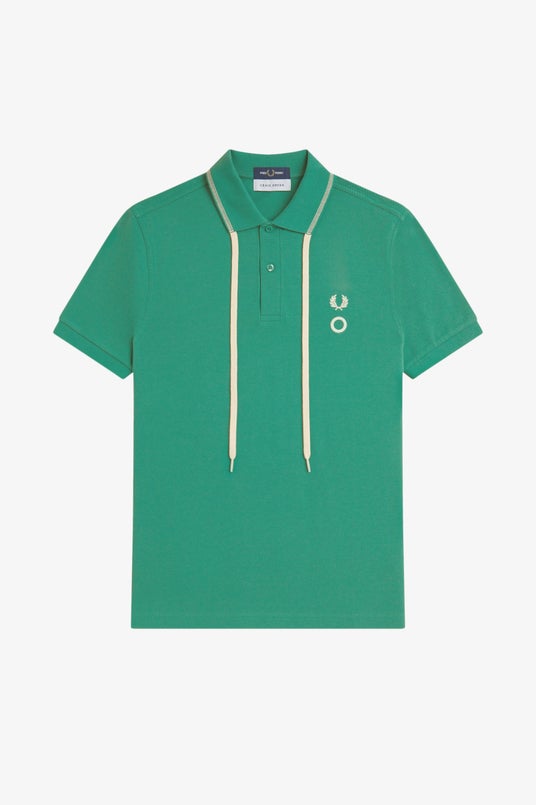 コレクションの起点となるのはフレッドペリーシャツ。スポーツウェアとしての本質は損なうことなくアップデートされ、オリジナルシルエットにアレンジ。ブラックとグリーン2色のポロシャツには、ポロカラーに通されたロングドローコードを採用。機能的なディテールを、精緻なバランスで取り入れています。
