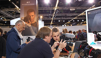 製品について担当者に尋ねる来場者。熱心なファンあってこそのフォトキナがだ、が来年以降も盛況を維持できるかはわからない