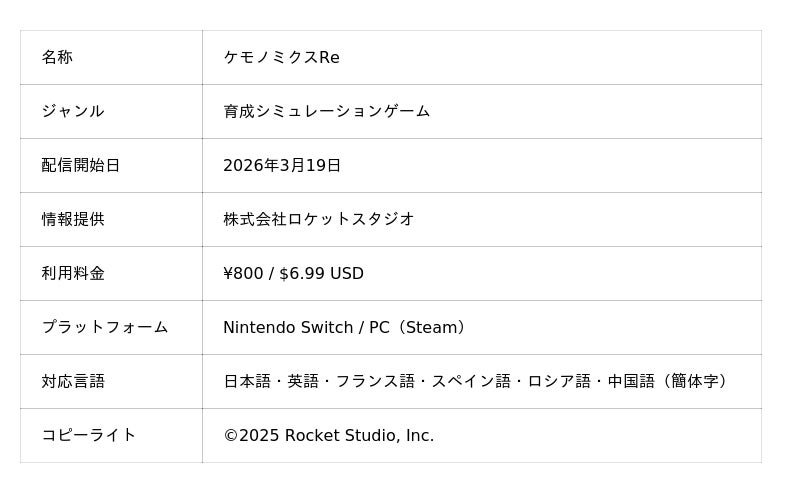 株式会社ロケットスタジオ(本社:札幌、代表取締役:竹部隆司)は、育成シミュレーションゲーム『ケモノミクスRe』を本日2026年3月19日にNintendo SwitchおよびPC(Steam)向けダウンロード専用タイトルとして発売したことをお知らせいたします。『ケモノミクスRe』は、ニンテンドーDSiおよびニンテンドー3DS向けダウンロードタイトルとして展開された「ケモノミクス」シリーズをベースに、現代のプレイ環境に合わせて再構築されたリメイク作品です。