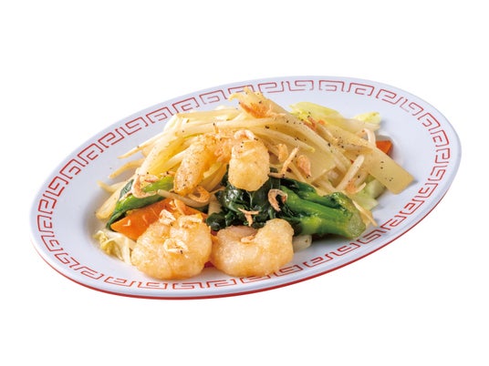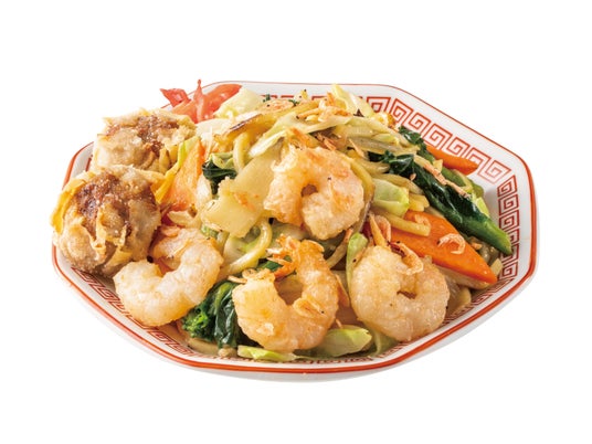 強火で香ばしく焼き上げたもちもちの太麺に、ぷりっぷりの海老とジューシーな揚げ焼売を豪快にトッピングしています。さらに、春の彩を添える紅海老、ほろ苦い菜の花、シャキシャキ食感のタケノコが絶妙なアクセントに。ニンニクのパンチと蝦油の芳醇な香りが食欲を刺激し、一口ごとに旨みが広がる贅沢な一皿です。海老の量は通常サイズの他、2倍・4倍からお選びいただけます。