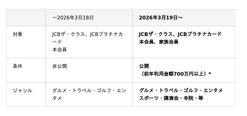 株式会社ジェーシービー (本社:東京都港区、代表取締役会長 兼 執行役員社長:二重 孝好、以下:JCB)は、JCBザ・クラス、JCBプラチナカードの一部会員様向けに、通常では手に入らない特別な体験を提供するサービス「Special Offer」を2026年3月19日から内容を一層拡充して提供します。