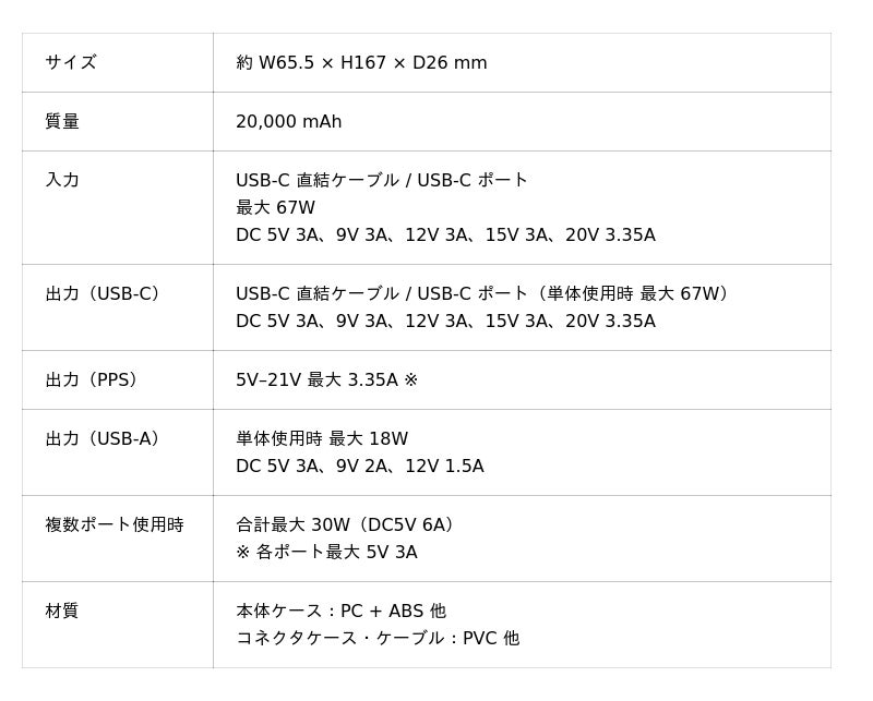 USB‑C直結ケーブルおよびUSB‑Cポートは最大67W出力に対応。