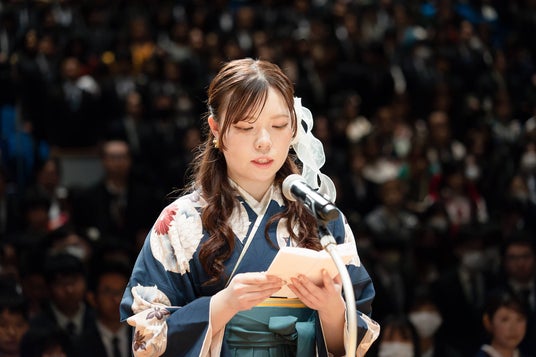 国際ビジネス公務員大学校の増子校長は、「学び続ける心や失敗を恐れない勇気、人への感謝の気持ちを忘れず、変化の激しい時代を力強く歩んでほしい」と式辞を述べ、卒業生を代表して国際ビジネス公務員大学校の卒業生が答辞を述べました。