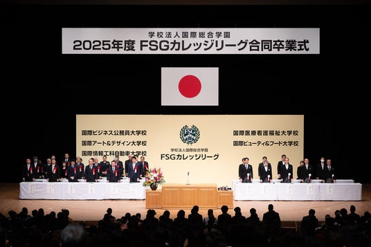 NSGグループの学校法人国際総合学園「FSGカレッジリーグ」(福島県郡山市)5校による合同卒業式がは3月5日、郡山市のけんしん郡山文化センターで行われ、国際ビジネス公務員大学校、国際アート&デザイン大学校、国際情報工科自動車大学校、国際医療看護福祉大学校、国際ビューティ&フード大学校の卒業生計921名が、新たな門出を迎えました。