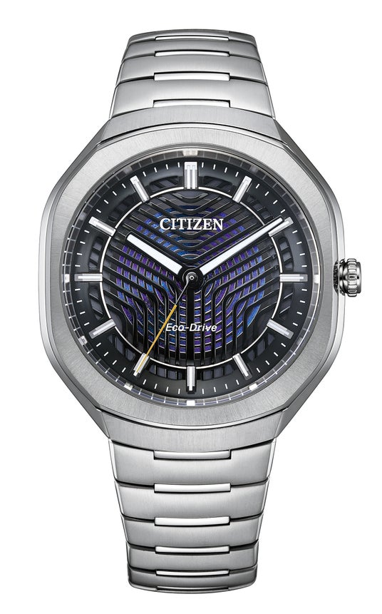 本モデルは、光にまつわる科学の歴史にインスパイアされており、太陽光や室内のわずかな光を電気に換えて時計を動かし続けるシチズン独自の技術エコ・ドライブの革新と進化を表現した斬新なデザインが特長です。「PHOTON」とは、光のエネルギーが量子としてやりとりされる際の単位を表します。文字板は、波紋のようなスリットの入った2枚の金属板が重なり、スリットの隙間からは光が反射することで、さまざまな表情や色味になる構造色文字板※3がのぞきます。ムーブメントは、一度フル充電すれば365日動き続ける新型ムーブメントCal.E036を搭載。半世紀にわたり光発電時計を開発し、その中でも新しい表現技法にチャレンジしてきたシチズンだからこその複雑な文字板構造のモデルです。ケースとバンドは軽量で耐傷性に優れたスーパーチタニウムTM※4を採用しています。丸みを帯びた八角形のケースにシームレスなバンドがつながることで、時計全体を包み込む一体感があり、なめらかな形状ながらアイコニックな造形です。
