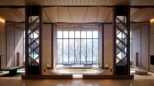2層吹き抜けの開放的な空間に天井まで続くガラス面を配置し、屋外の緑を堪能できるようにいたしました。ラウンジ中央にはエスコンフィールドの形状に着想を得たデザインを施し、球場の熱狂と安らぎが共存する、この場所でしか味わえない時間を提供します。